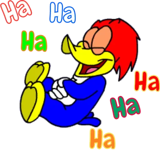 Um desenho de um pássaro amarelo com cabelo vermelho, óculos e roupa azul, caído de costas com expressão de alegria, rodeado por várias palavras 'Ha' coloridas.