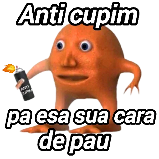 Um personagem laranja com olhos grandes e um bico, segurando um spray de combustível com fogo, com o texto 'Anti cupim pa esa sua cara de pau'.