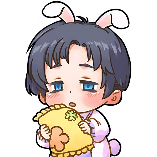 Menino de olhos azuis com orelhas de coelho e cabelo preto curto segurando uma fatia de pizza com queijo.
