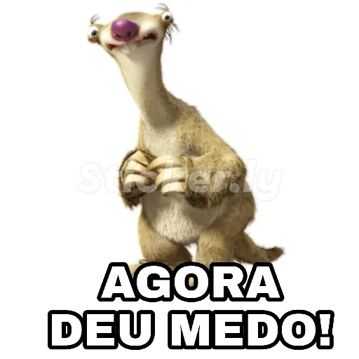 Um personagem de desenho animado, tipo dinossauro ou réptil, com expressão facial engraçada e olhos arregalados. Abaixo dele, está escrito 'AGORA DEU MEDO!'