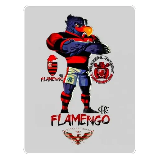 Um mascote de um pássaro com penas azuis, bico laranja e uniforme vermelho e preto, com o texto 'FLAMENGO' abaixo.
