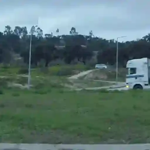 Um veículo branco em uma estrada ao lado de uma área gramada com árvores e céu nublado ao fundo.