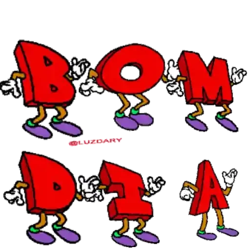 Letras coloridas formando 'BOM DIA' com pernas e braços, estilo cartoon.