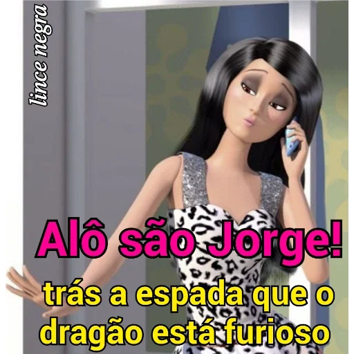 Uma boneca de brinquedo com cabelo preto e vestido branco com manchas pretas, falando ao celular com expressão surpresa. O texto 'Alô são Jorge! trás a espada que o dragão está furioso' aparece em destaque.