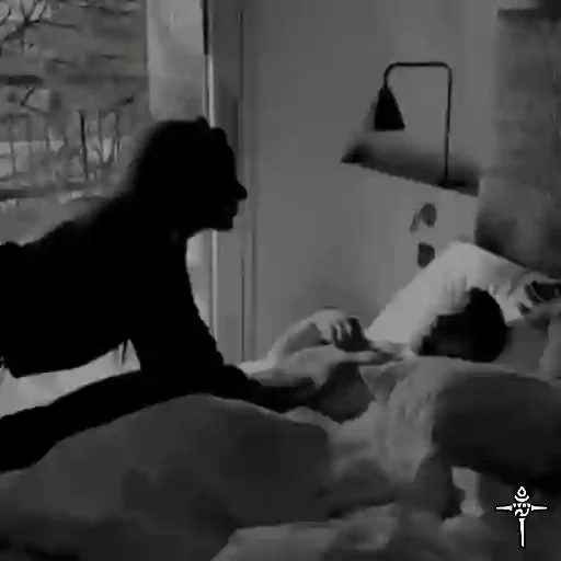 Um gato preto salta sobre uma cama onde uma pessoa e outro gato estão deitados. A cena é em preto e branco.