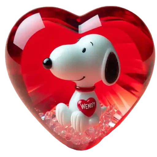 Um cãozinho branco, provavelmente o Snoopy, dentro de um coração vermelho brilhante. Ele tem um coração vermelho no peito com a palavra 'LOVE' escrita.