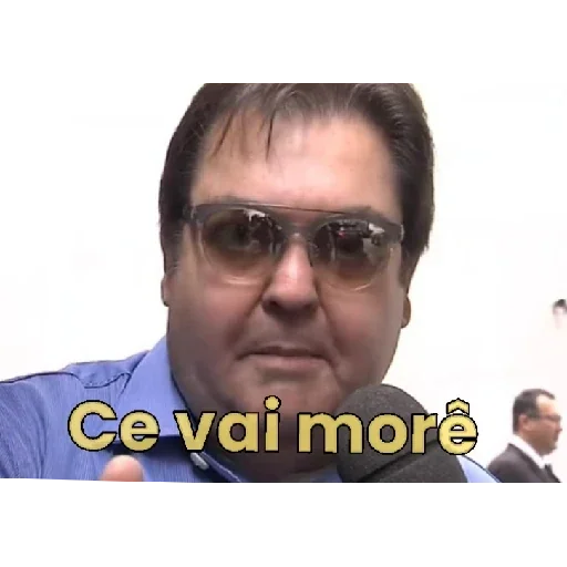 Um homem com cabelo castanho e óculos escuros, vestindo uma camisa azul, com a frase 'Ce vai more' em amarelo na parte inferior.