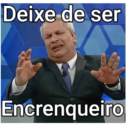 Um homem de meia-idade, de terno e gravata, com as mãos levantadas em gesto de desaprovação ou impaciência. Sobreposto, o texto 'Deixe de ser Enrenqueiro'