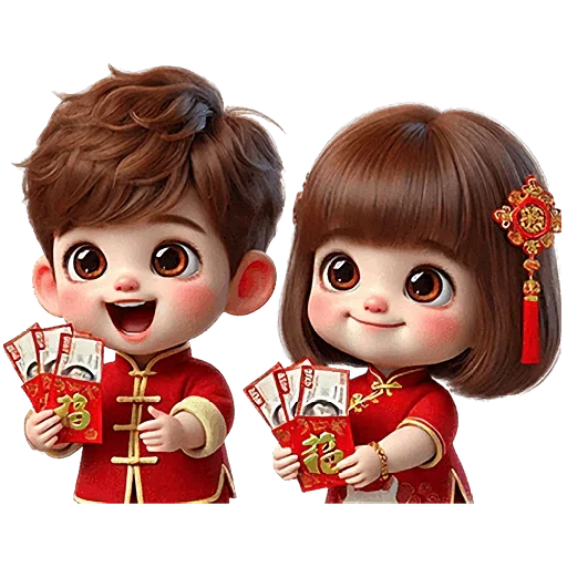 Dois personagens infantis fofos, um menino e uma menina, vestidos com roupas vermelhas e douradas, segurando dinheiro vermelho. Eles têm expressões felizes e rosáceas nas bochechas.