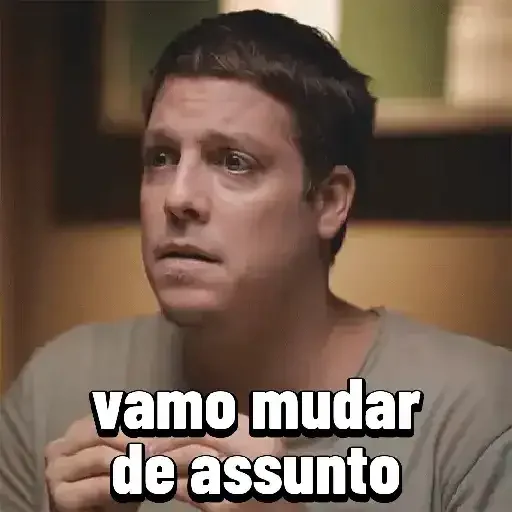 Homem com expressão séria e texto "vamo mudar de assunto" sobreposto.