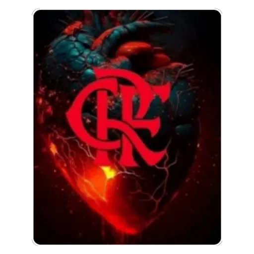 Coração vermelho com veias saltadas e chamas, com um símbolo vermelho no centro. O fundo é escuro.