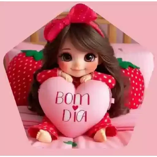 Uma boneca de pelúcia com cabelo castanho e um laço rosa na cabeça segura um travesseiro em forma de coração rosa com as palavras 'Bom Dia' escrito nele. Ela está vestida com uma roupa rosa com bolinhas brancas.