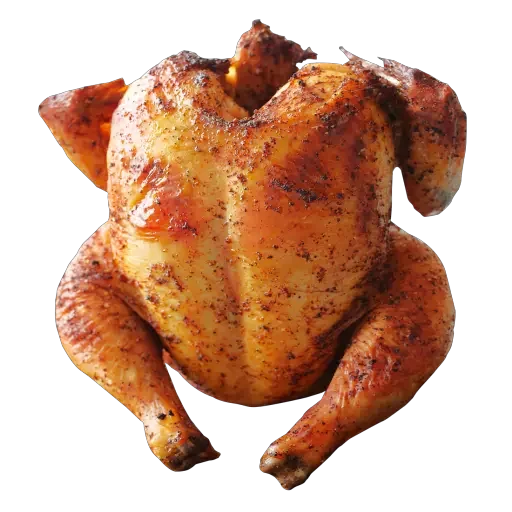 Um frango assado inteiro, com a pele dourada e crocante, temperado com ervas e especiarias.