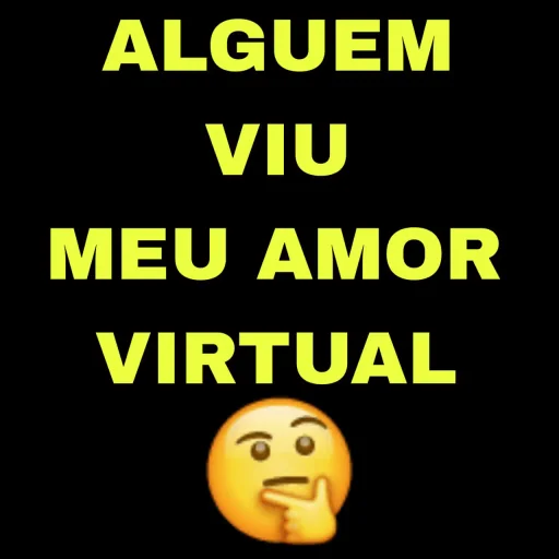 Um emoji de rosto pensativo com a mão no queixo e texto em amarelo que diz 'ALGUEM VIU MEU AMOR VIRTUAL'.