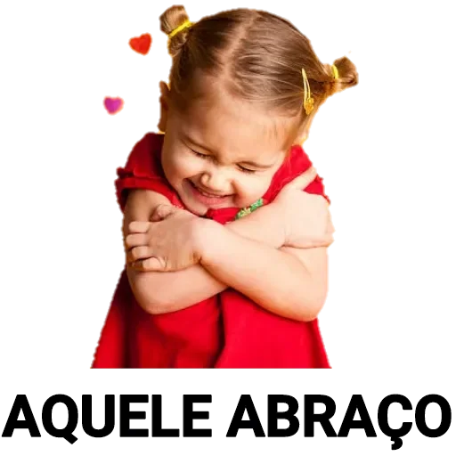 Menina com pigtails e vestido vermelho dando um abraço, com texto 'AQUELE ABRAÇO' e corações ao fundo.
