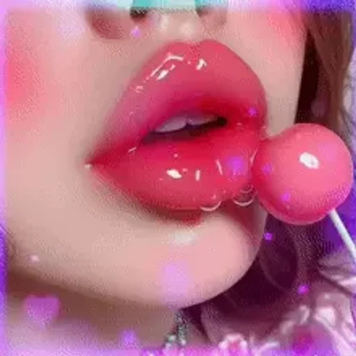 Rosto de uma mulher com os lábios pintados de rosa brilhante e um doce de pirulito rosa na boca.