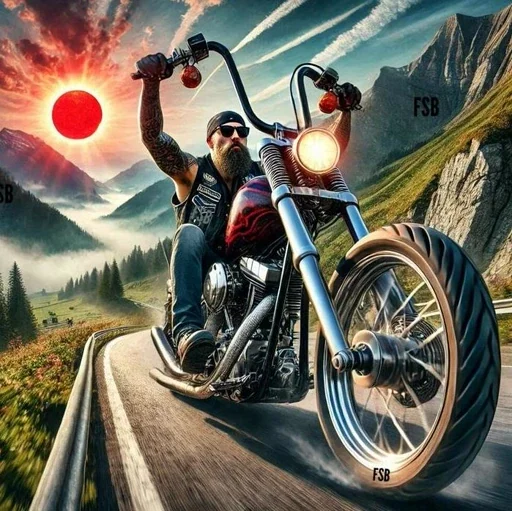 Um motociclista em uma estrada sinuosa com uma vista deslumbrante de montanhas e pôr do sol ao fundo. Ele está com os braços levantados em celebração.