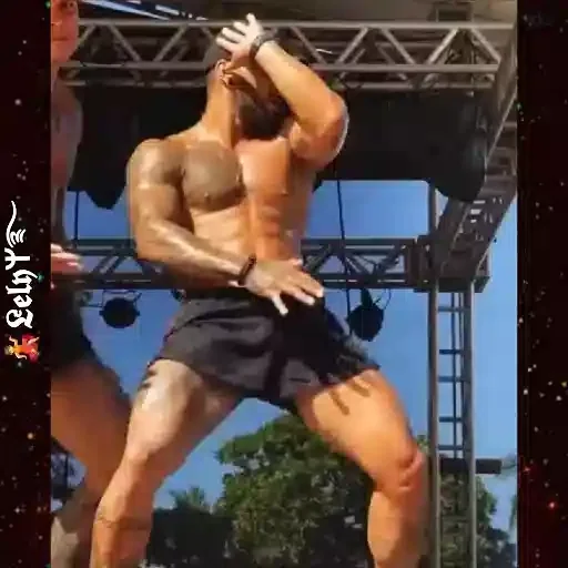 Homem musculoso dançando em um palco ao ar livre, com as mãos na cabeça. Ele está sem camisa e veste shorts pretos. Ao lado, há um texto que diz 'Bela época'.
