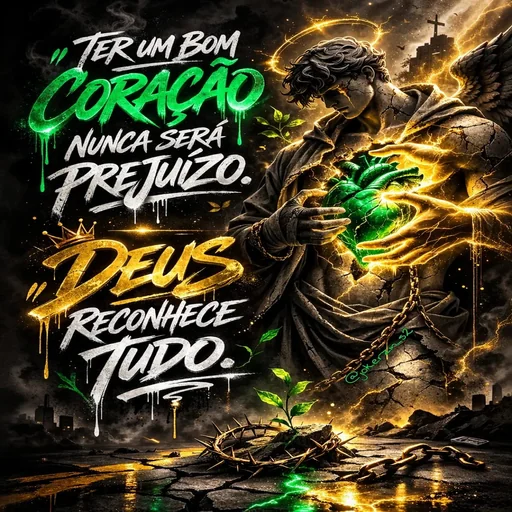 Imagem de Jesus Cristo com um coração verde e uma auréola, cercado por efeitos de luz amarela. O texto "Ter um bom coração nunca será prejuízo. Deus reconhece tudo" aparece ao lado.