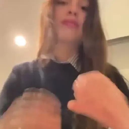 Uma jovem com cabelo castanho e um suéter preto fazendo um gesto com a mão.