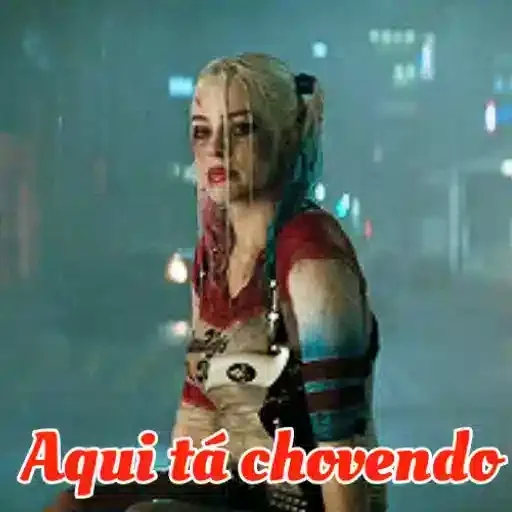 Harley Quinn com expressão séria, vestindo uma camisa vermelha e um cinto com uma arma, em um cenário noturno. 'Aqui tá chovendo'