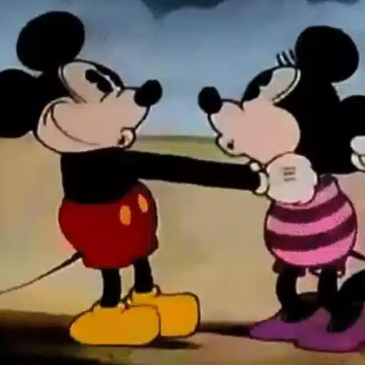Mickey e Minnie Mouse se enfrentam com os braços esticados, Mickey de short vermelho e sapatos amarelos, Minnie de vestido listrado rosa e roxo.