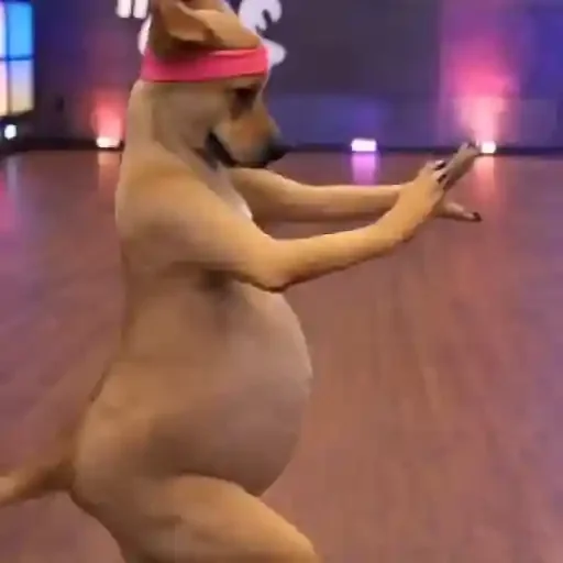 Um cachorro nu, com uma faixa rosa na cabeça, fazendo uma pose de dança em um piso de madeira, com luzes coloridas ao fundo.