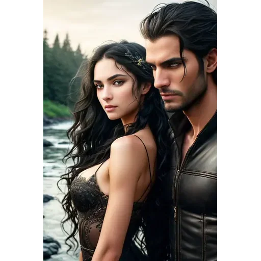 Um casal de jovens adultos, um homem e uma mulher, posando juntos em frente a um rio com árvores ao fundo. A mulher tem cabelo preto longo e está vestida com um top preto, enquanto o homem tem cabelo preto curto e veste uma jaqueta preta.