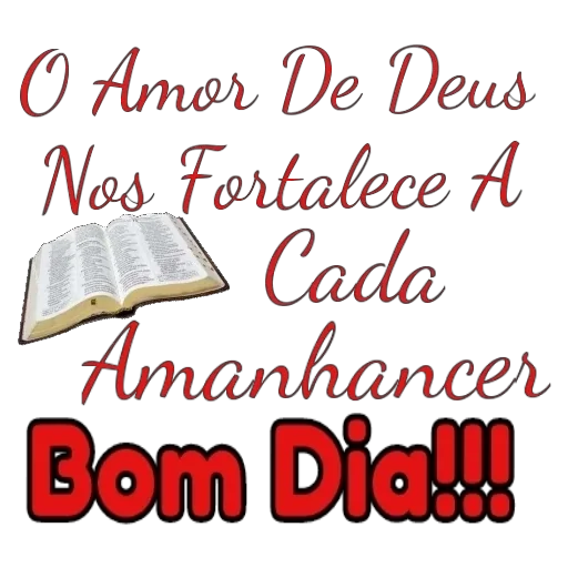 Uma imagem com texto 'O Amor De Deus Nos Fortalece A Cada Amanhancer' em vermelho e 'Bom Dia!!!' em vermelho com contorno preto, acompanhada de uma ilustração de um livro aberto.