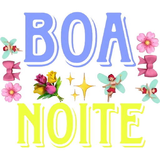 Um sticker colorido com a frase 'BOA NOITE' em letras grandes, decorado com flores rosadas, estrelas amarelas e pequenas fadas.