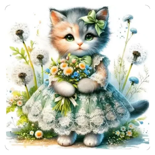Gatinha fofa vestida com um vestido verde e um laço no cabelo, segurando um buquê de flores.