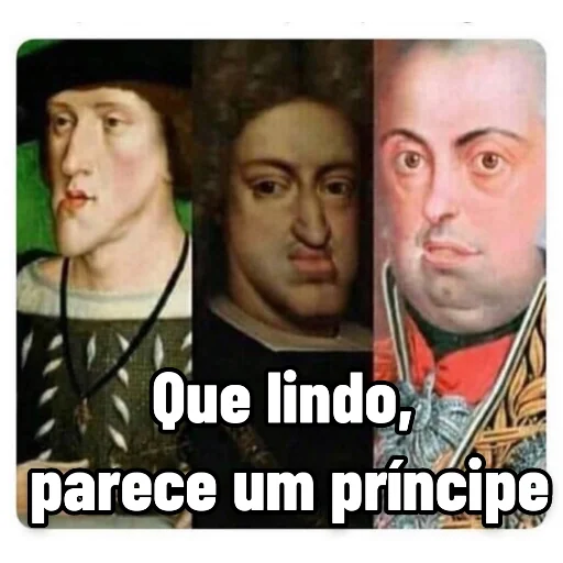 Três retratos de homens renascentistas com expressão séria, acompanhados do texto 'Que lindo, parece um principe'.