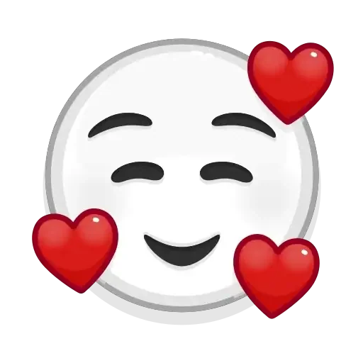 Rosto de emoji com olhos fechados e sorriso, rodeado de três corações vermelhos.