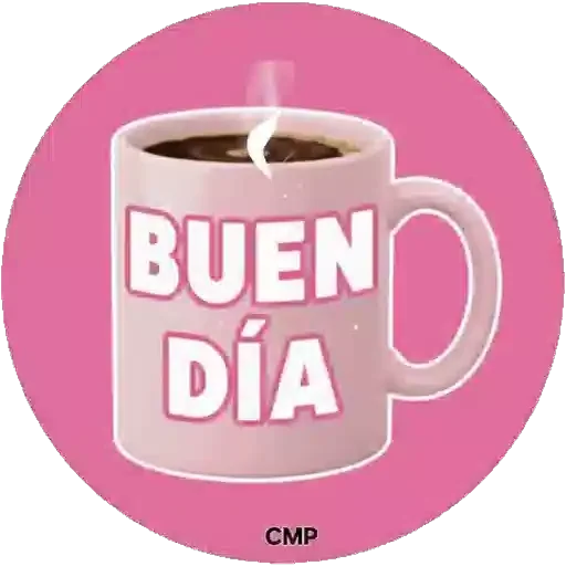 Uma xícara de café com o texto 'BUEN DÍA' em letras grandes e brancas com contorno rosa, em um círculo rosa.