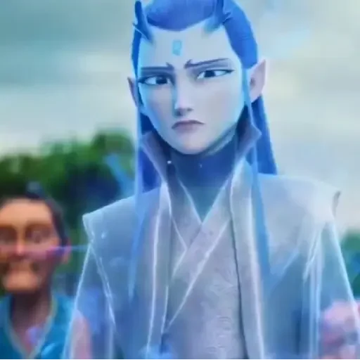 Personagem de anime com cabelo azul e marca azul na testa, vestindo roupa cinza, com outro personagem ao fundo.