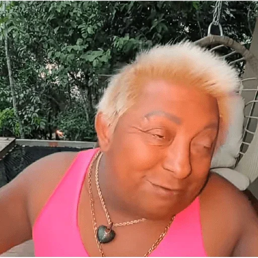 Uma mulher mais velha com cabelo branco curto e uma camiseta rosa, usando um colar com um pingente em forma de coração, fazendo uma careta engraçada ao lado de uma área externa com árvores.