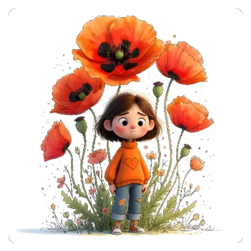 Menina fofa com cabelos castanhos e um casaco laranja em meio a flores de papoula vermelhas e verdes.
