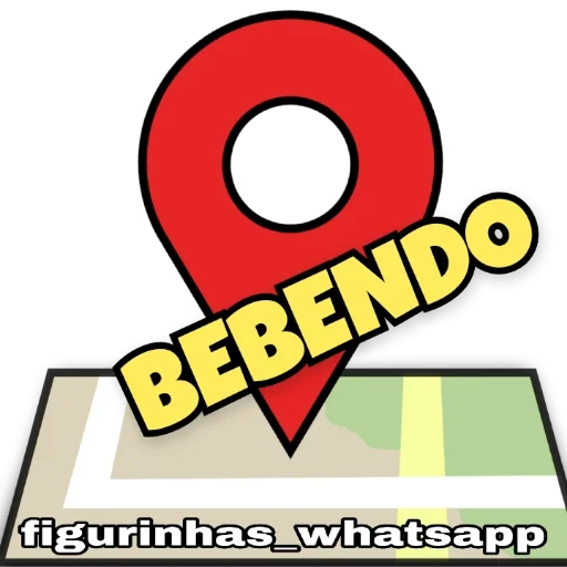 Um pin vermelho de localização com o texto 'BEBENDO' em amarelo sobreposto. Abaixo, há um mapa com áreas verdes e uma faixa amarela. O texto 'figurinnhas_whatsapp' aparece na parte inferior.
