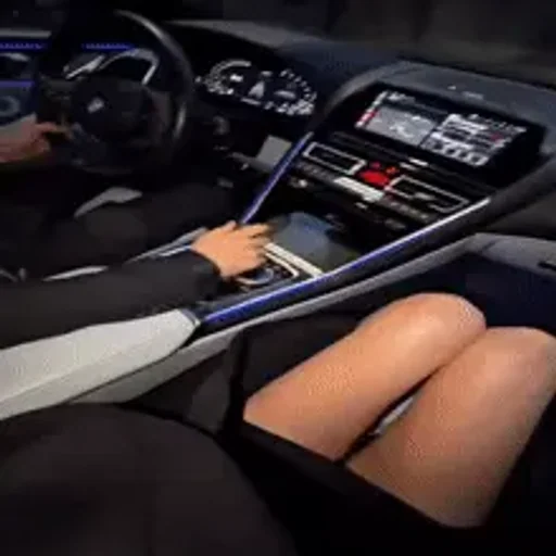 Mãos ao volante e pernas cruzadas dentro de um carro, com o painel e central multimídia ao fundo.