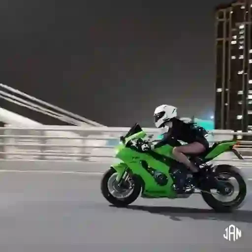 Um motociclista de branco capacete e jaqueta preta pilota uma moto verde limão em uma ponte, à noite.
