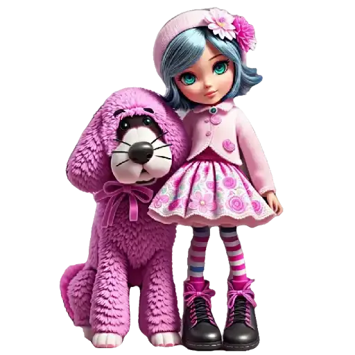 Menina de cabelo azul e olho verde ao lado de um cachorro rosa gigante, ambos com expressão triste.