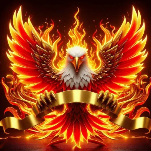 Águia com asas abertas em chamas, olhos vermelhos, com faixa dourada na frente. Fundo escuro.