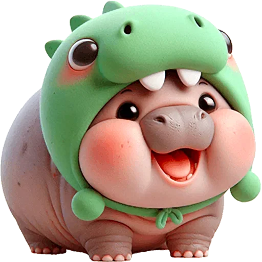 Um hipopótamo cinza com bochechas rosadas usando uma fantasia de cabeça de dinossauro verde, com olhos grandes e…