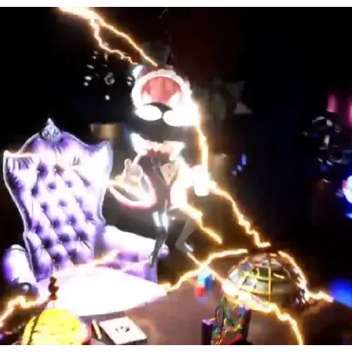 Um gato preto com olhos vermelhos senta em uma cadeira xadrez, cercado por raios de luz amarela.