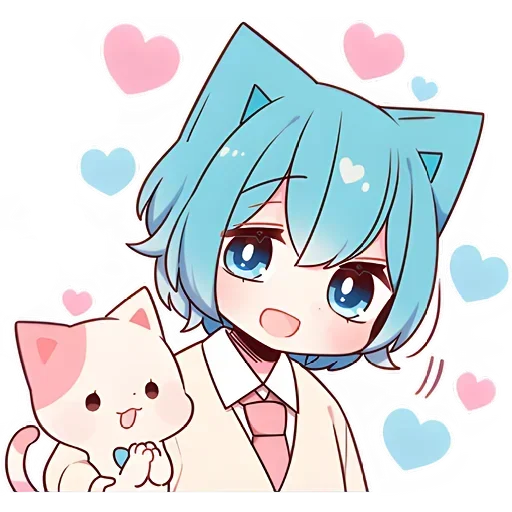 Menina com cabelo azul e orelhas de gato, com um gato branco ao lado, rodeados de corações rosa e azuis.