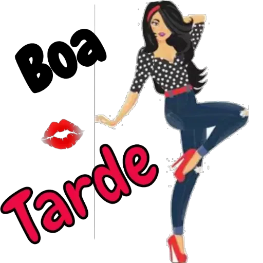 Uma mulher de cabelo preto e um sorriso sensual, vestida com uma blusa preta e branca, calças azuis e salto alto vermelho, com o texto 'Boa Tarde' e um beijo.