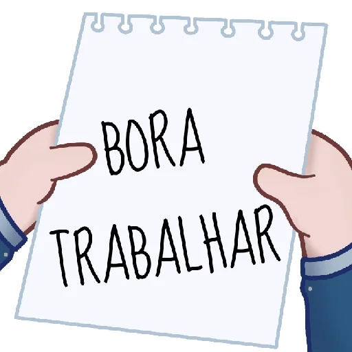 Mãos segurando um bloco de notas com a frase 'BORA TRABALHAR' escrita em preto.