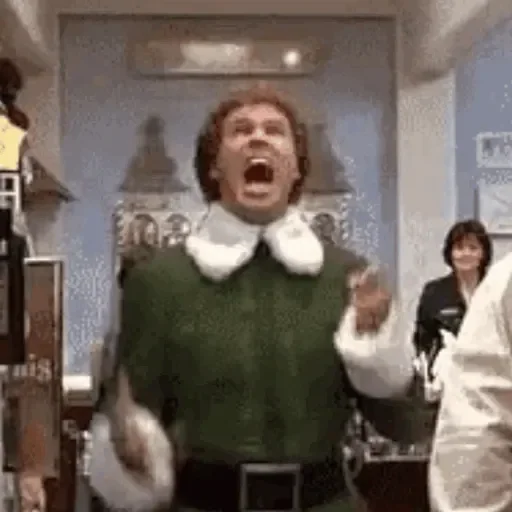 Um homem com cabelo ruivo e um suéter verde com gola branca está com a boca aberta e os braços levantados. Ele parece estar em um ambiente interno com uma mulher ao fundo.