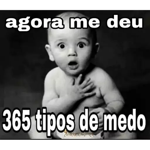 Um bebê com expressão de surpresa e medo, com a mão no peito. A imagem traz o texto "agora me deu 365 tipos de medo" sobreposta.
