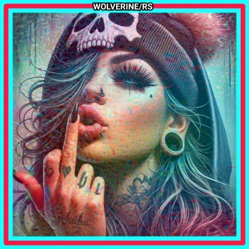 Uma mulher com cabelos azuis e um gorro com uma caveira branca fazendo um gesto com a mão e com os lábios. Ela tem tatuagens no pescoço e maquiagem pesada.